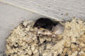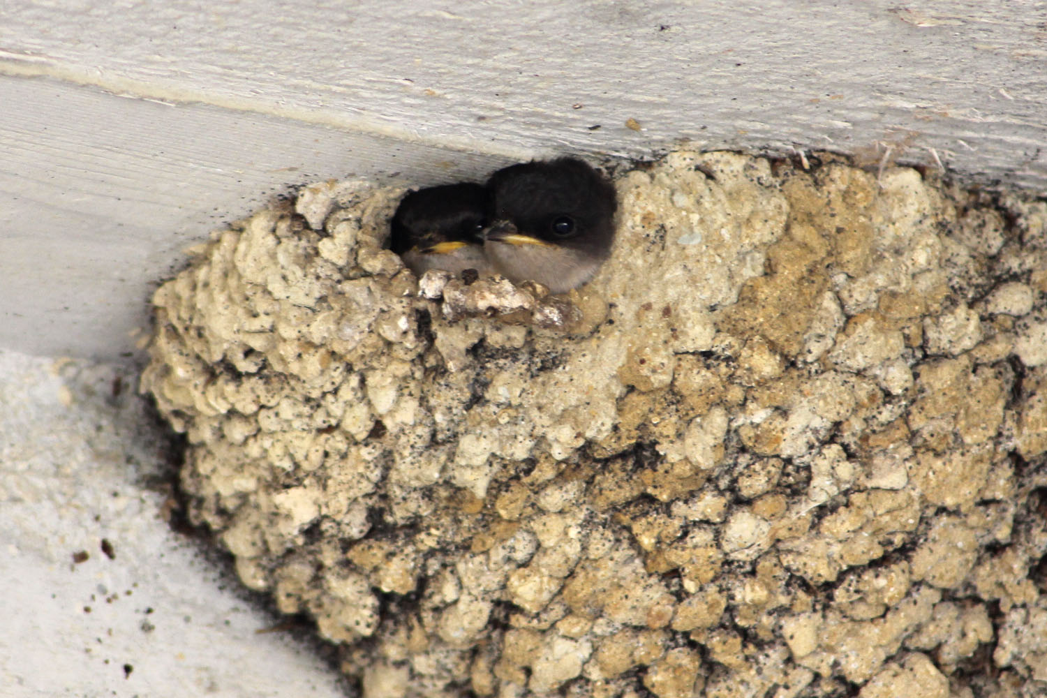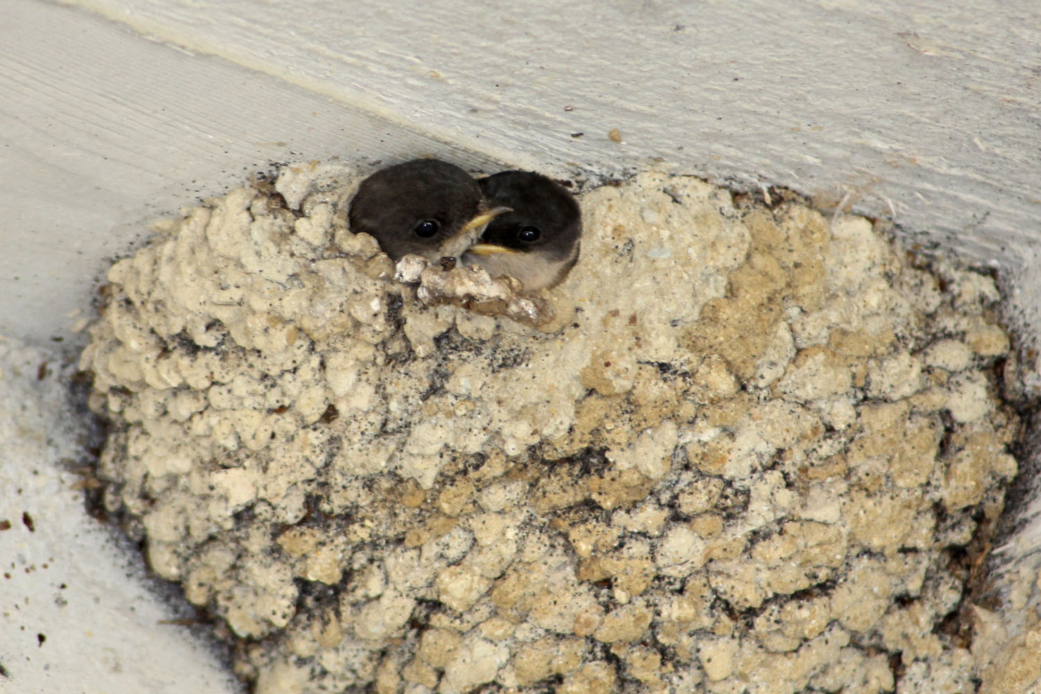 The House Martin is a Summer visitor to the UK and can be told apart from the Swallow or Swift by its shorter, stubbier wings and white body extending under its chin. House Martins typically make a cup shaped nest under the eaves of a roof.