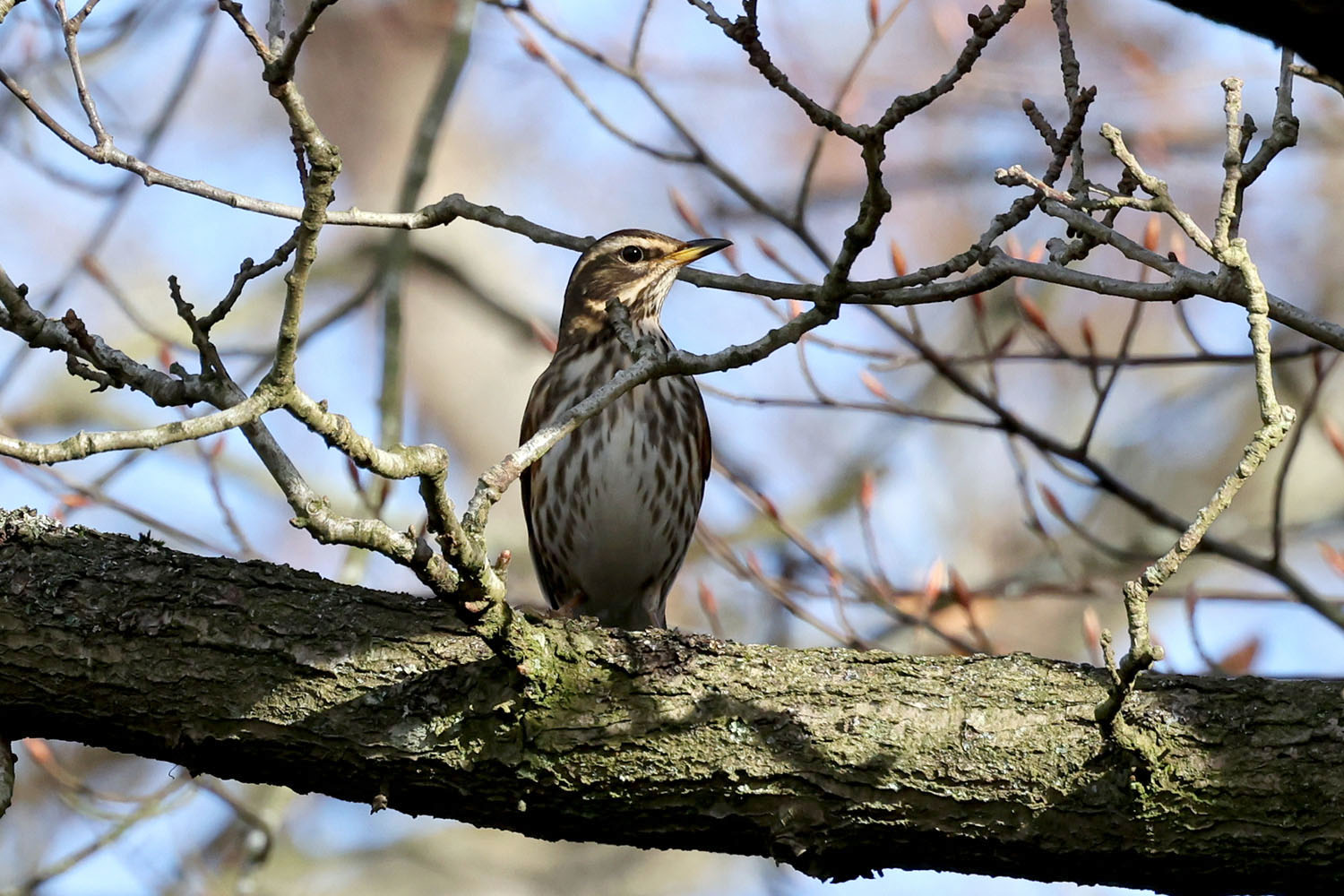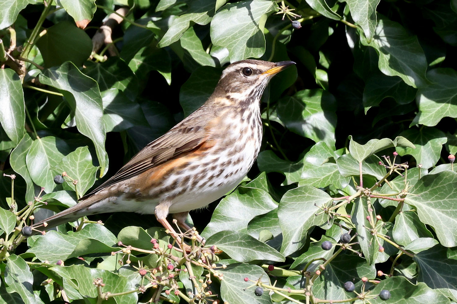 The Redwing is a member of the thrush family and like its cousin the Fieldfare is a Winter visitor to the UK. They're not a feeder bird but they will take berries from bushes and trees as well as foraging on the ground.